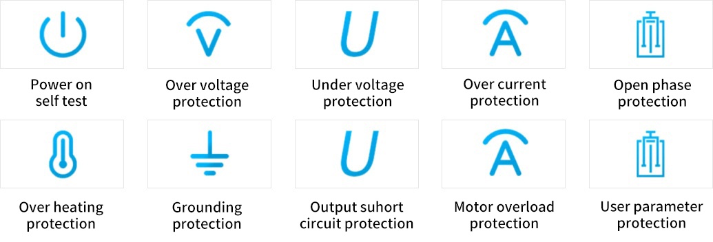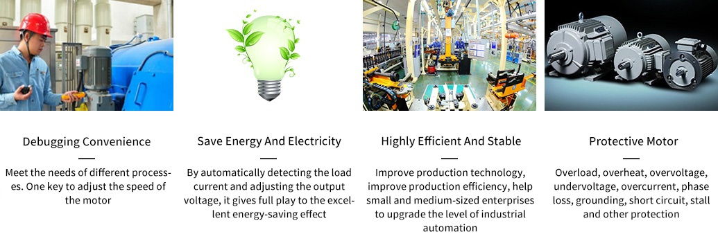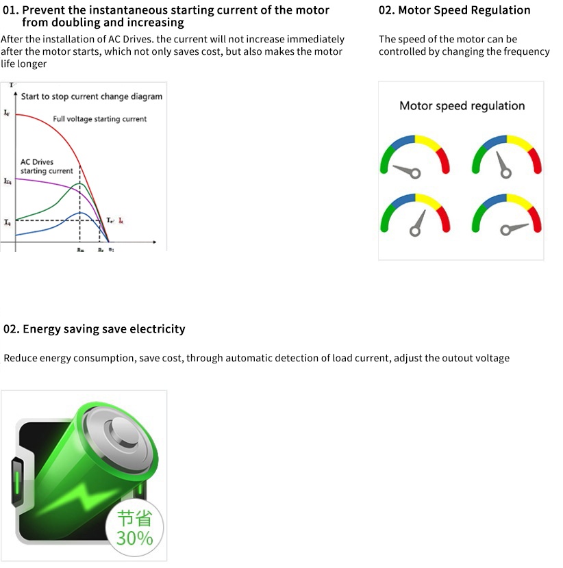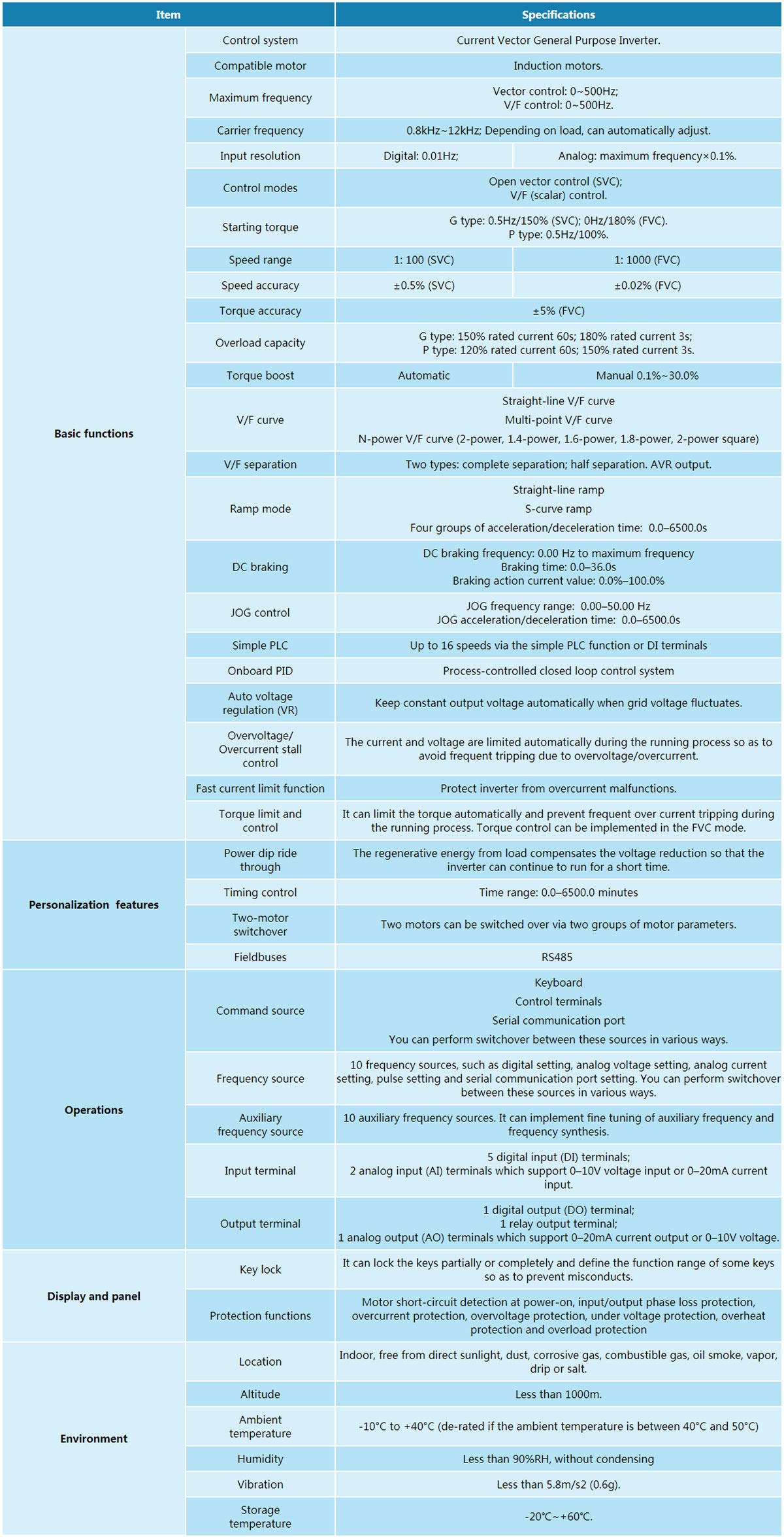 Product Features | ● Easy installation: support screw installation and guide rail installation; ● High power density: effectively achieve product volume minimization; ● Fast current limiting: hardware fast current limiting function, avoid frequency inverter overcurrent failure; ● Simple PLC, multi-speed operation: through the built-in PLC or control terminal to achieve up to 16 speed operation; ● Built-in PID: easy to realize process control closed-loop control system; ● Over-voltage and over-loss speed control: automatic limit of current and voltage during operation to prevent frequent over-current voltage trip; ● VF separation: two ways: full separation and half separation. Automatic voltage regulator AVR output. |