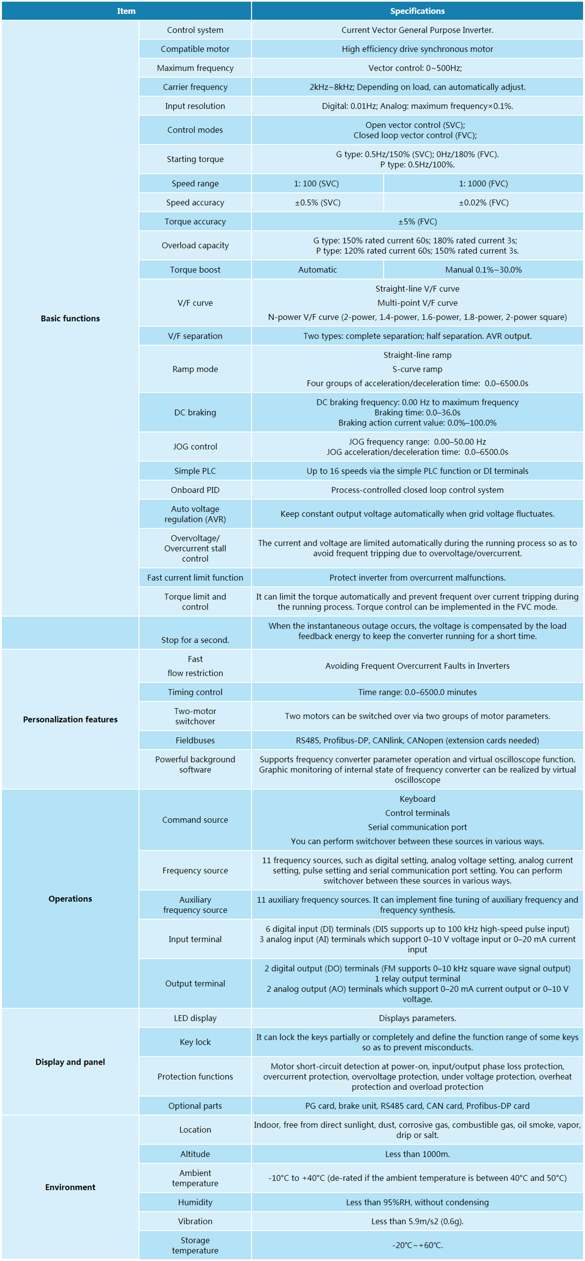 Product Features | ● Supports Modbus; ● Current vector general purpose converter with high fusion of performance and function; ● High efficiency drive induction motor and synchronous motor; ● Can automatically adjust the carrier frequency according to the load characteristics; ● Through built-in PLC or control terminal to achieve up to 16 section speed operation; ● "Excavator" feature, automatic torque limit during operation to prevent frequent overcurrent trip, closed-loop vector mode can achieve torque control; ● Two sets of motor parameters, two motor switching control can be realized; ● Supports fieldbuses such as RS485, PROFIBUS-DP, CANlink, and CANopen; ● Practical PI regulation, with constant pressure water supply function. |