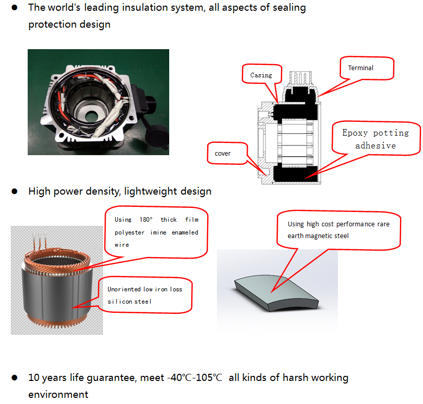 In the new energy vehicle control system electric drive market demand, for the steering system to provide supporting drive motor solutions, steering pump drive motor at a fixed speed, driving steering pump work.  Its performance advantages are reflected in: low consumption material, all-round sealing protection design, low noise, high efficiency and energy saving, low maintenance cost and other characteristics, suitable for pure electric logistics vehicles.