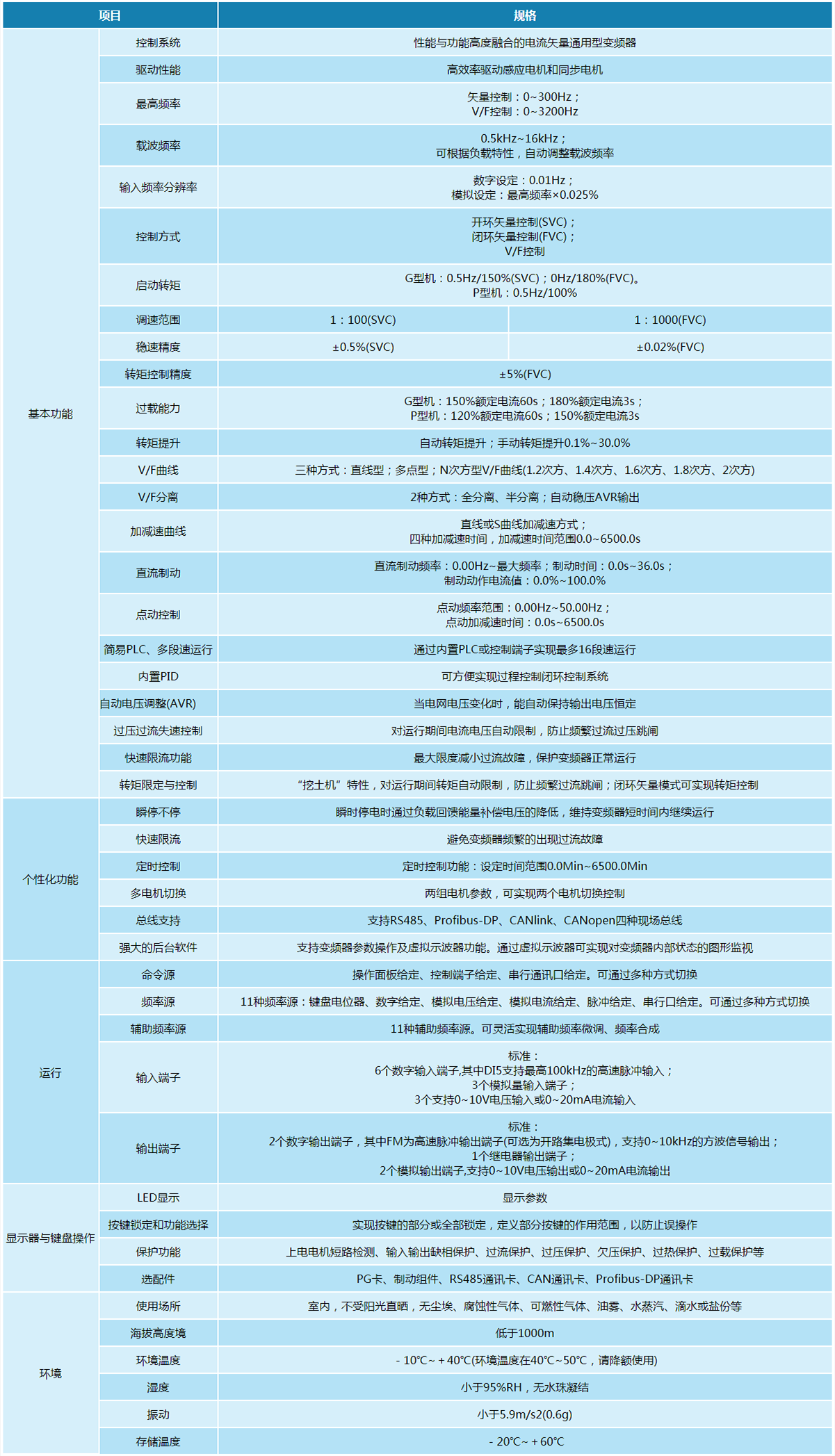 產(chǎn)品特點(diǎn) | ● 支持Modbus總線; ● 性能與功能高度融合的電流矢量通用變頻器; ● 高效率驅(qū)動(dòng)感應(yīng)電機(jī)和同步電機(jī)(H501系列); ● 可根據(jù)負(fù)載特性,自動(dòng)調(diào)節(jié)載波頻率; ● 通過內(nèi)置PLC或控制端子實(shí)現(xiàn)最多16段速運(yùn)行; ● “挖土機(jī)”特性,對(duì)運(yùn)行期間轉(zhuǎn)矩自動(dòng)限制,防止頻繁過流跳閘;閉環(huán)矢量模式可實(shí)現(xiàn)轉(zhuǎn)矩控制; ● 兩組電機(jī)參數(shù),可實(shí)現(xiàn)兩個(gè)電機(jī)切換控制; ● 支持RS485、Profibus-DP、CANlink、CANopen等現(xiàn)場(chǎng)總線; ● 實(shí)用PI調(diào)節(jié),具有恒壓供水功能。 |