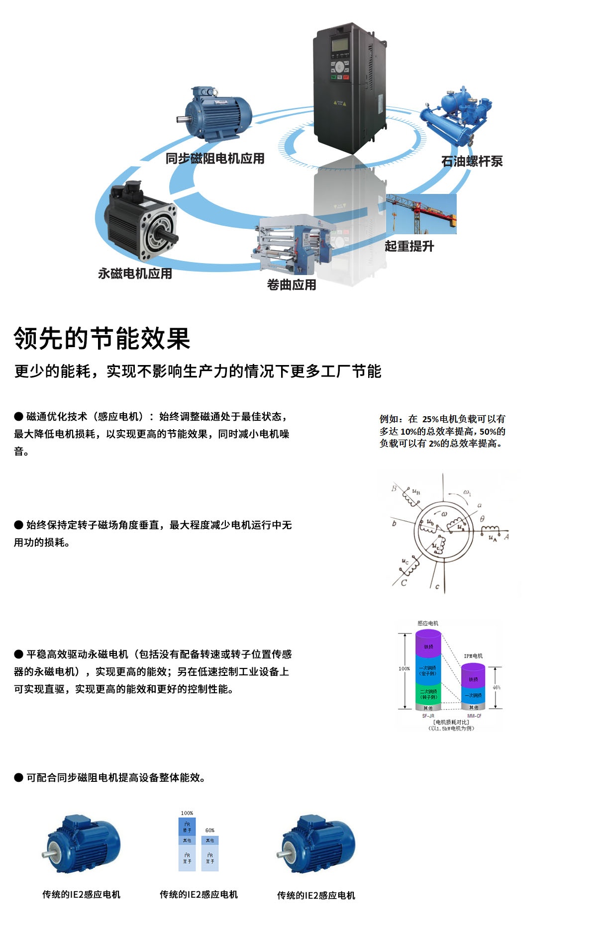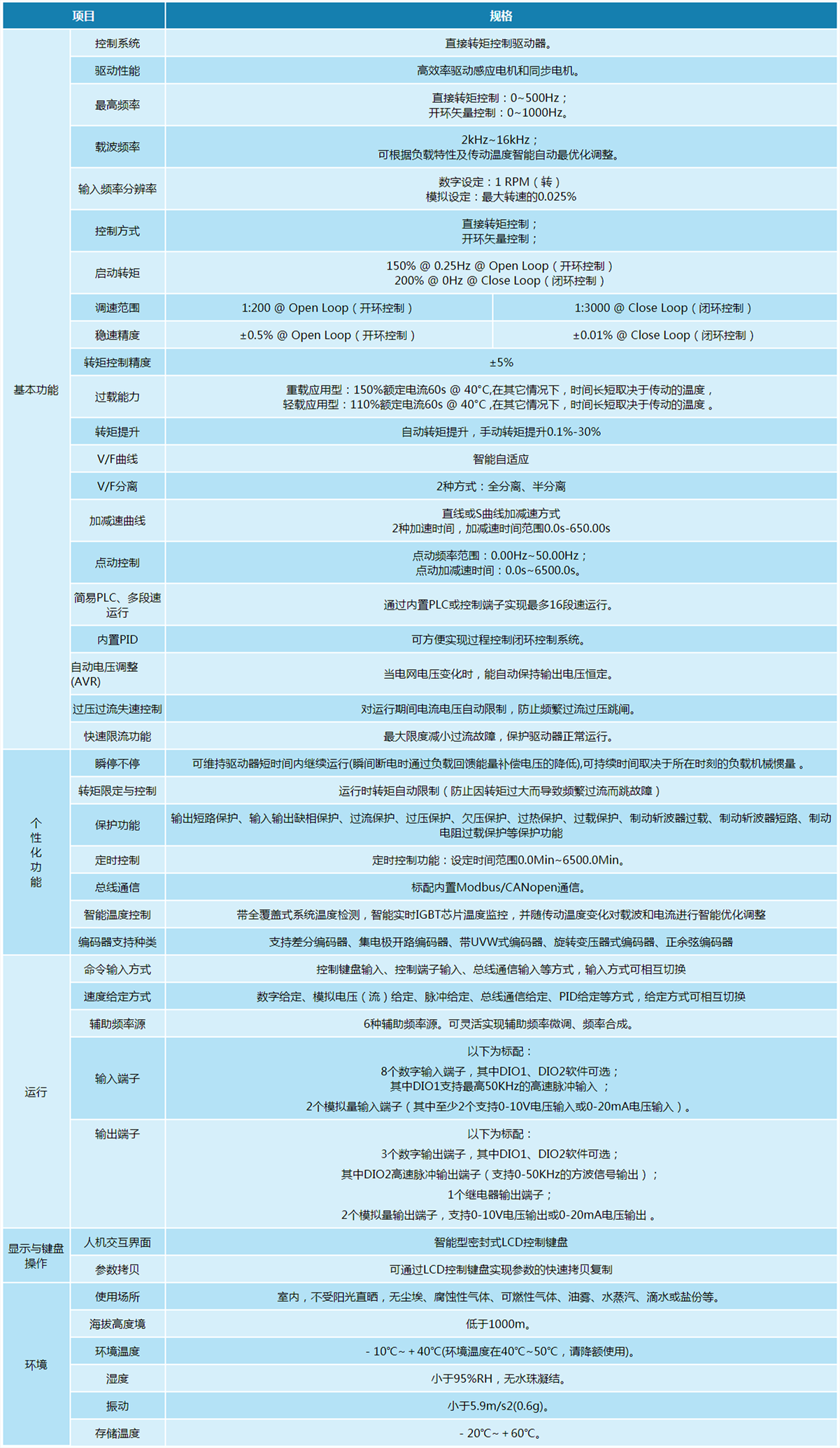 產(chǎn)品特點 | ● 具有轉(zhuǎn)矩響應快、控制結構簡單、易于實現(xiàn)全數(shù)字化; ● 優(yōu)異的開環(huán)轉(zhuǎn)矩、速度控制、實現(xiàn)性能等同于帶編碼器的閉環(huán)控制; ● 實時準確磁通跟隨與優(yōu)化,實現(xiàn)電機時刻處于高效節(jié)能運行; ● 領先的弱磁控制技術; ● 功能豐富,操作簡單。 |