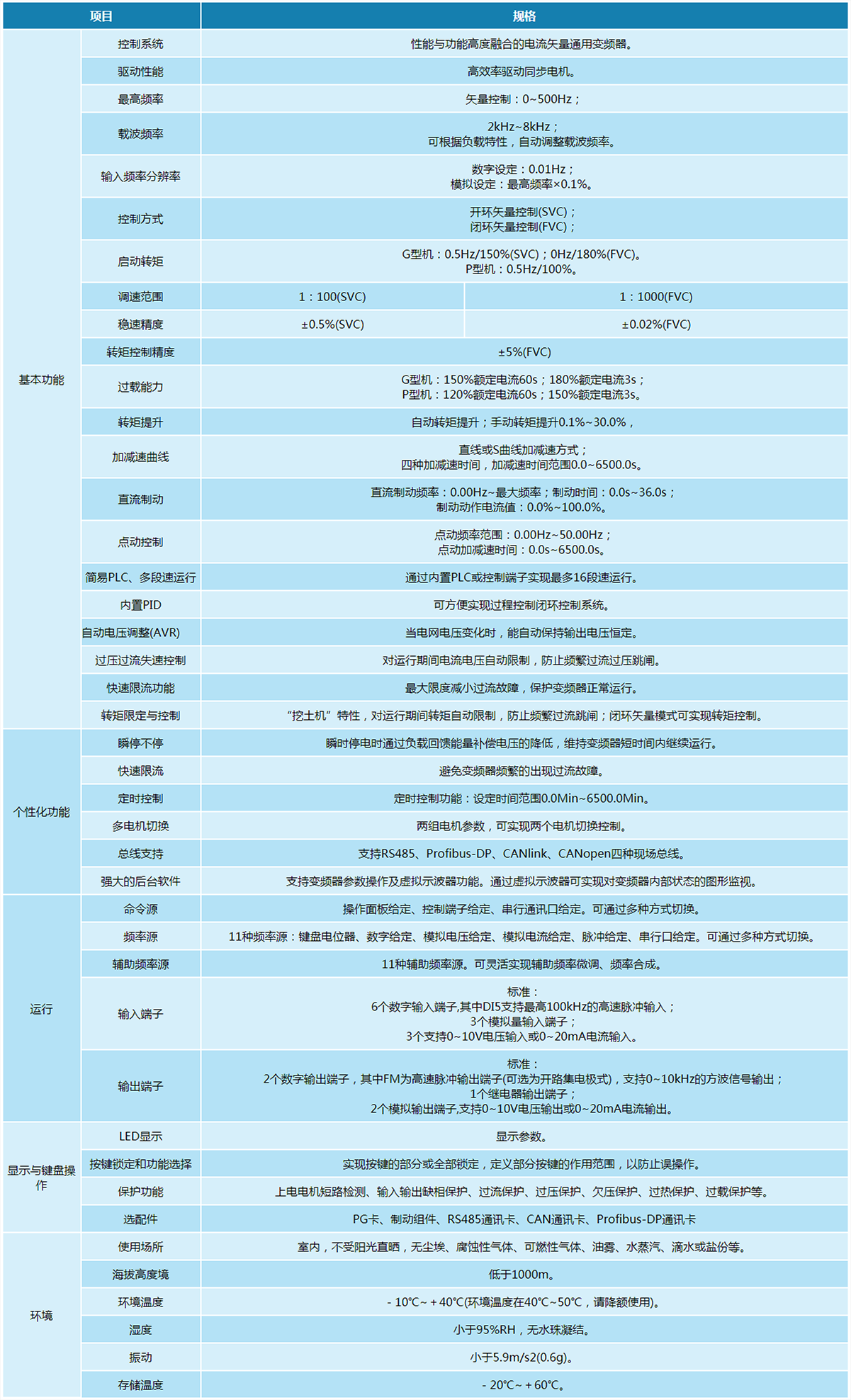 產(chǎn)品特點(diǎn) | ● 支持Modbus總線; ● 性能與功能高度融合的電流矢量通用變頻器; ● 高效率驅(qū)動(dòng)感應(yīng)電機(jī)和同步電機(jī); ● 可根據(jù)負(fù)載特性,自動(dòng)調(diào)節(jié)載波頻率; ● 通過內(nèi)置PLC或控制端子實(shí)現(xiàn)最多16段速運(yùn)行; ● “挖土機(jī)”特性,對運(yùn)行期間轉(zhuǎn)矩自動(dòng)限制,防止頻繁過流跳閘,閉環(huán)矢量模式可實(shí)現(xiàn)轉(zhuǎn)矩控制; ● 兩組電機(jī)參數(shù),可實(shí)現(xiàn)兩個(gè)電機(jī)切換控制; ● 支持RS485、Profibus-DP、CANlink、CANopen等現(xiàn)場總線; ● 實(shí)用PI調(diào)節(jié),具有恒壓供水功能。 |